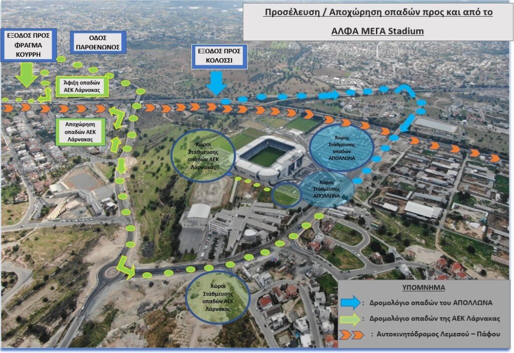 Για την ομαλή προσέλευση και αποχώρηση τους προς και από το στάδιο, οι οπαδοί του ΑΠΟΛΛΩΝ καλούνται να κατευθυνθούν προς το ΑΛΦΑΜΕΓΑ Stadium, μέσω του αυτοκινητόδρομου προς Πάφο, να ακολουθήσουν την έξοδο προς Κολόσσι και ακολούθως μέσω της αερογέφυρας, να ακολουθήσουν τη στροφή δεξιά προς το στάδιο. Οι φίλοι του ΑΠΟΛΛΩΝ μπορούν να σταθμεύσουν τα οχήματα τους, στους προκαθορισμένους χώρους στάθμευσης του σταδίου.