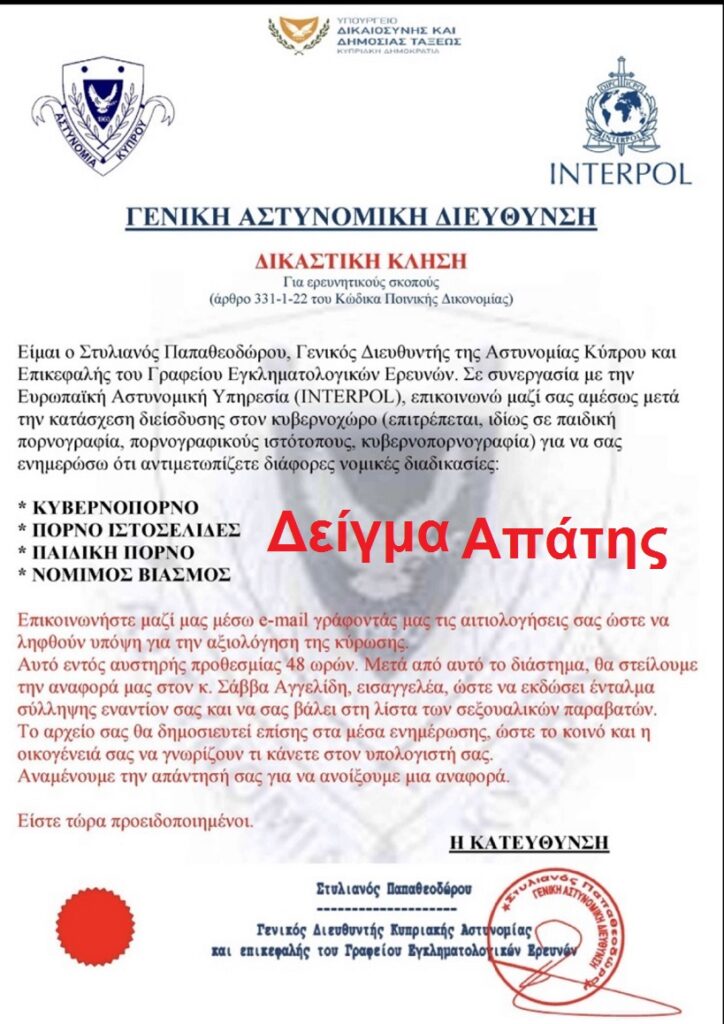 Τα ηλεκτρονικά μηνύματα αποστέλλονται από πλαστές ηλεκτρονικές διευθύνσεις και περιλαμβάνουν επιστολές που φέρουν λογότυπα του Υπουργείου Δικαιοσύνης και Δημοσίας Τάξεως, της Αστυνομίας Κύπρου, καθώς και της Interpol. Στα ηλεκτρονικά μηνύματα και επιστολές ονοματίζονται πρόσωπα, τα οποία αναφέρονται ως Εισαγγελέας και Γενικός Διευθυντής Κυπριακής Αστυνομίας και τα οποία παρουσιάζονται ψευδώς ως οι αποστολείς των μηνυμάτων και υπογράφοντες των επιστολών.