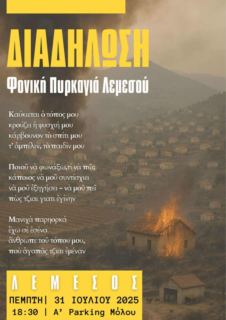 Εκδήλωση διαμαρτυρίας με αφορμή την πρόσφατη πυρκαγιά στην Ορεινή Λεμεσό, προγραμματίζεται να πραγματοποιηθεί σήμερα το απόγευμα, 31 Ιουλίου 2025, στη Λεμεσό.