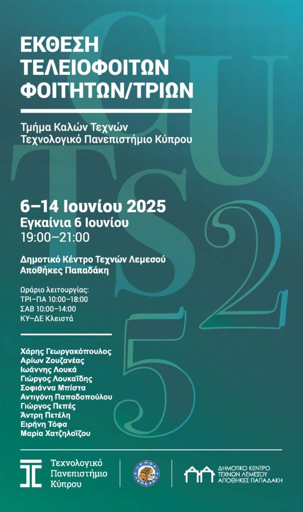 Το Τμήμα Καλών Τεχνών του Τεχνολογικού Πανεπιστημίου Κύπρου παρουσιάζει, στο Δημοτικό Κέντρου Τεχνών Λεμεσού – Αποθήκες Παπαδάκη, την έκθεση των τελειόφοιτων φοιτητριών και φοιτητών του με τον αμφίσημο τίτλο CUTS 2025.