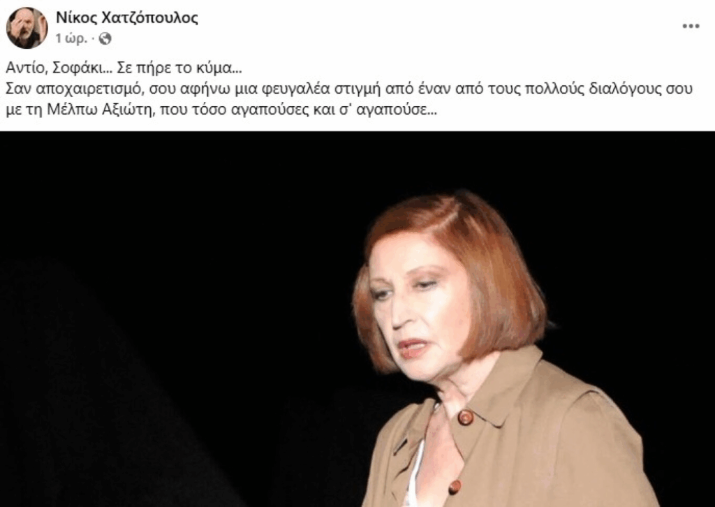«Αντίο, Σοφάκι… Σε πήρε το κύμα… Σαν αποχαιρετισμό, σου αφήνω μια φευγαλέα στιγμή από έναν από τους πολλούς διαλόγους σου με τη Μέλπω Αξιώτη, που τόσο αγαπούσες και σ’ αγαπούσε…».